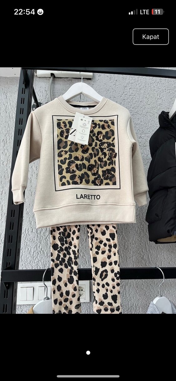Bej renkli, bol kesim kız çocuk sweatshirtü, yuvarlak yaka ve uzun kolludur. Önünde kürk detaylı leopar desenli baskı ve 'LARETTO' yazısı bulunur. 2/3 ve 4/5 yaş mevcut