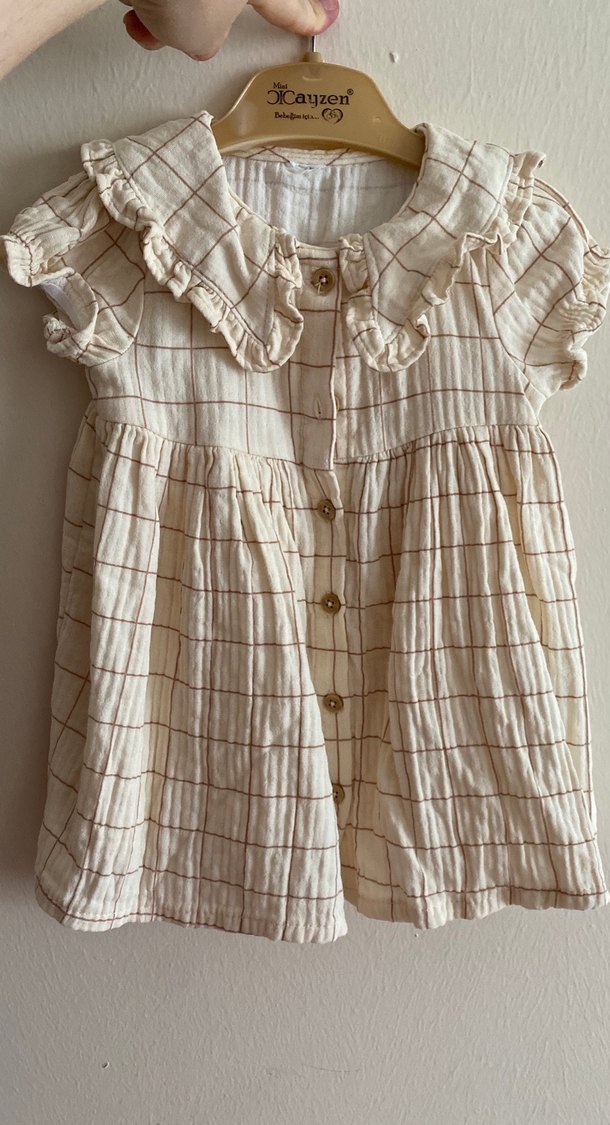 Kız çocuk müslin kumaştan, bol kesim, kısa kollu, yakalı ve fırfırlı detaylı, nakışlı pastel kare desenli elbise.