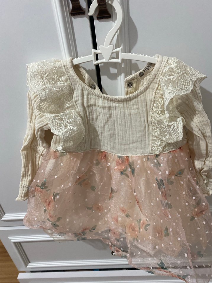 Bu bej kız çocuk elbisesi uzun kollu, dantel detaylı ve nakışlı çiçek desenlidir. Bol kesim, yuvarlak yaka ve pastel bohem tarzındadır.