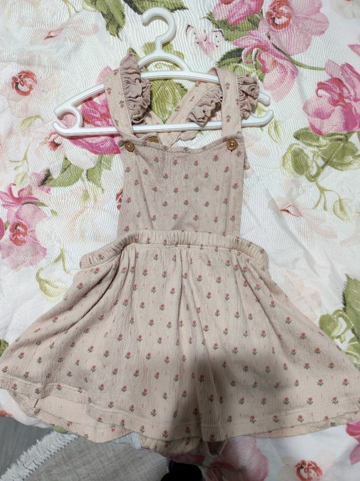 Bej renkli, nakışlı, fırfırlı askılı ve askısız yakalı, yumuşak sentetik kumaştan yapılmış bohem tarzda kız çocuk elbisesi.