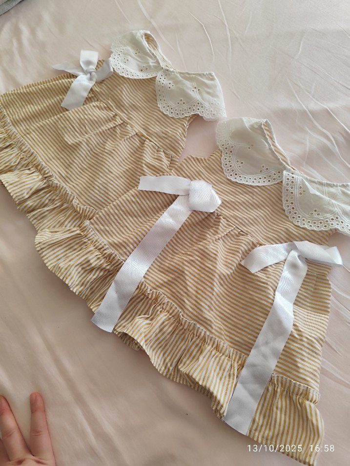 Bej pamuklu elbise, tekne yakası, nakışlı detaylar, fırfırlı ve askılı kollu, bohem tarzda ve regular kesim. sadece bir kere giydirdim ama kurdaleleri açıldı biride düştü yoksa yeni gibi ürün