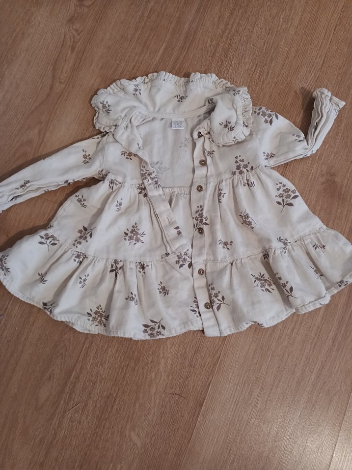 Yumuşak keten kumaştan, uzun kollu ve yakalı, bol kesim kız çocuk elbisesi. Nakışlı çiçek desenleri ve fırfır detaylarıyla bohem tarzda bir model.