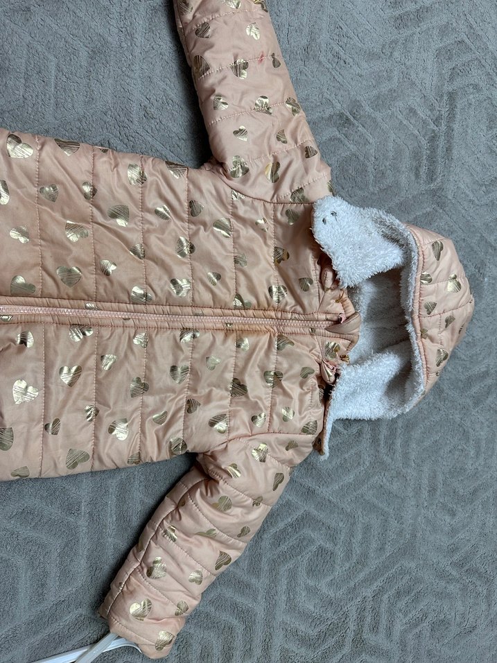 Nakışlı desenlere ve yakasında kesik detaya sahip bej renkli, kürklü kapüşonlu, sentetik kumaştan yapılmış kız çocuk montu.