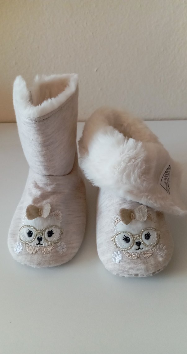 Yumuşak kumaş ve kürk detaylı, nakışlı baykuş desenli bej kız çocuk sıcak ev terliği. 23/24 numaradır