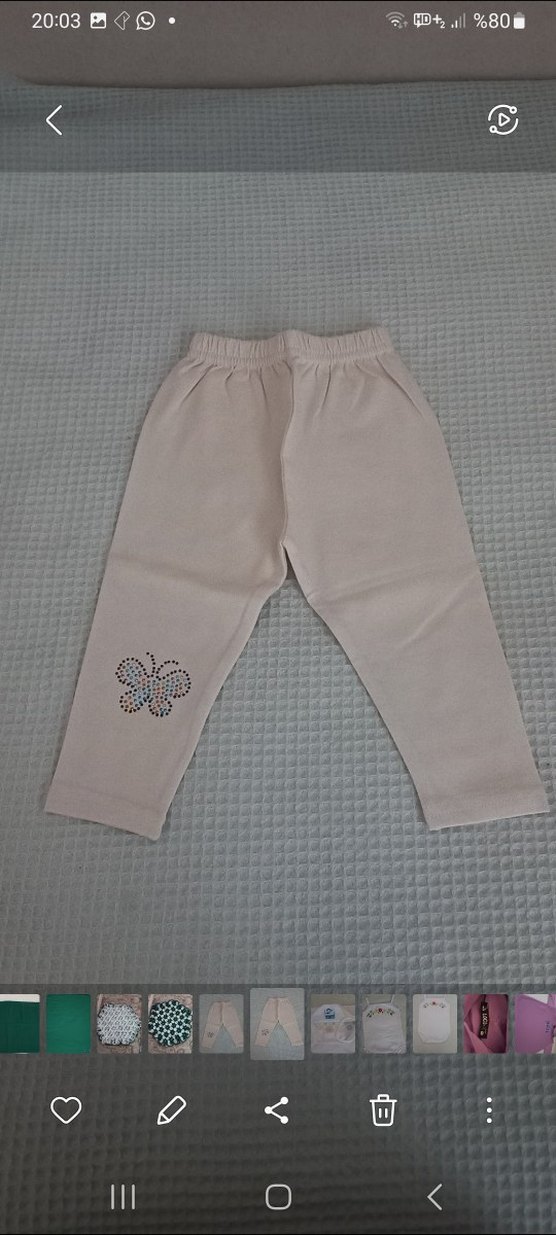 Pamuklu, dar kesim bej tayt, pul işlemeli kelebek nakışıyla sade ve rahat bir tarz sunar.