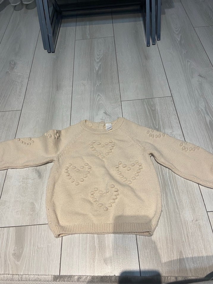 Uzun kollu, yuvarlak yakalı bej renk kız çocuk triko kazak, nakışlı kalp desenleri ve bol kesimi ile rahatlık sağlar. LCW temiz kazak , son görsele ekledim sadece arkasında ip çekmesi var tığ ile halledilir