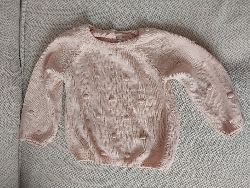 Kız çocuk için pastel bej renkte, uzun kollu, bol kesim ve örgü dokulu sade tasarımlı kazak. Arkada düğmeli kapama bulunur.