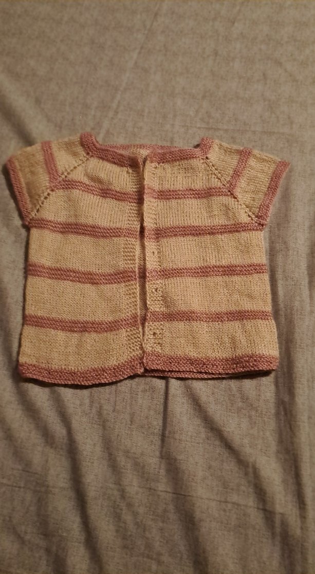 Bej renkli, kolsuz örgü kız çocuk hırkası, bol kesim ve hafif bohem tarzıyla yatay ince çizgilere sahiptir.