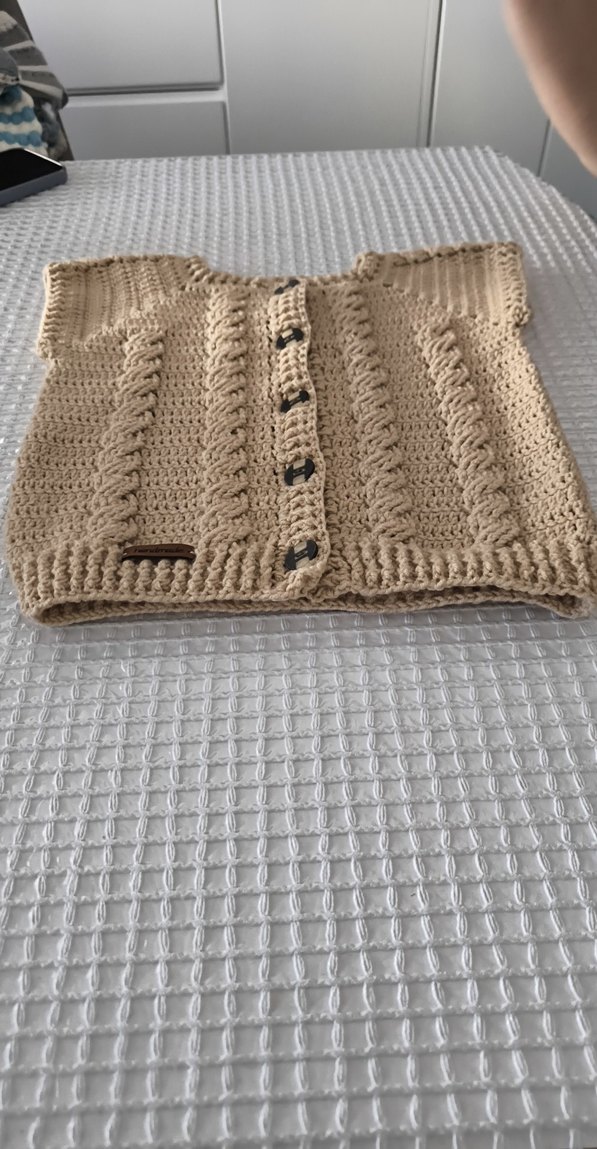 Kız çocukları için bej renkli, örgü dokulu kolsuz hırka. Bohem tarzda, düğmeli ve regular fit kesime sahip.