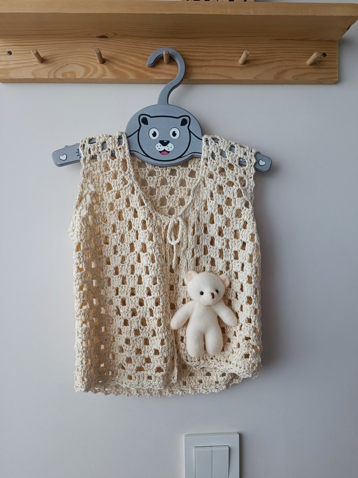 Bu bej renkli kız çocuk yeleği, kolsuz ve gevşek kesimdir. Örgü dokusu ve yuvarlak yaka detaylarıyla bohem ve retro tarzını yansıtır. pullu ipten yapilmistir