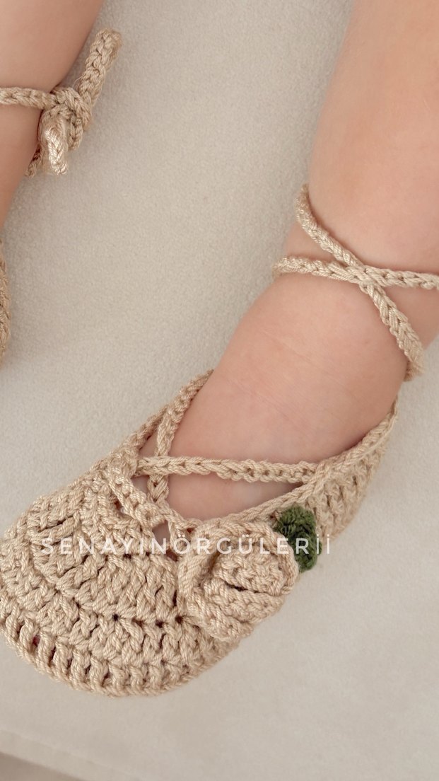 Bohem tarzda, yumuşak örgü kumaştan yapılmış bej kız çocuk botları, ince askı detaylarıyla.