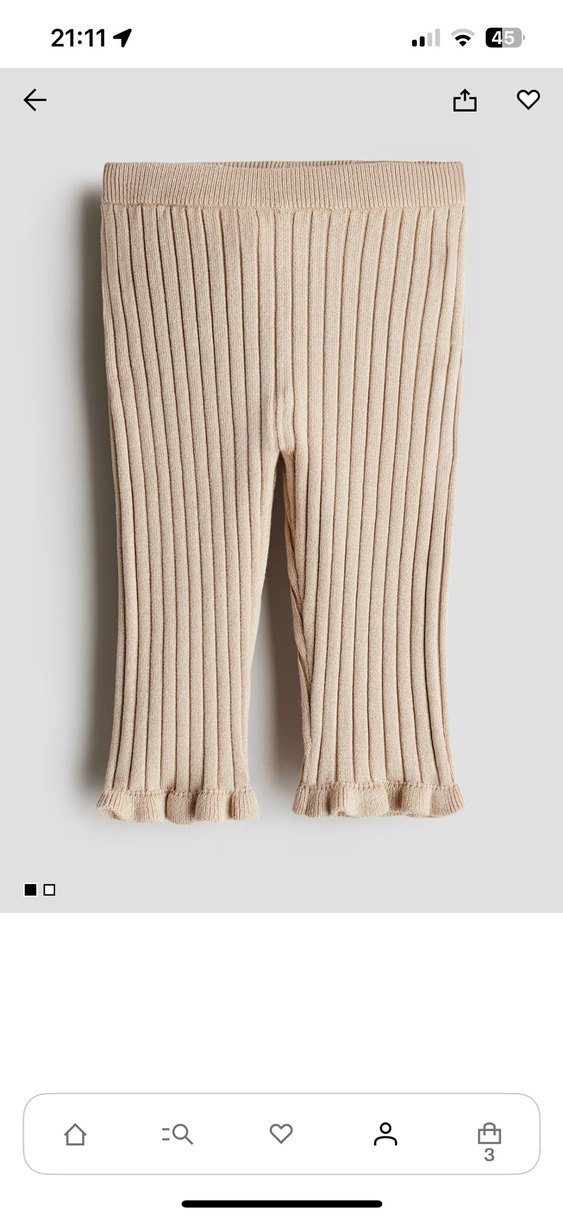 Yumuşak örgü kumaştan yapılmış, düz ve desensiz, ince kesim bej kız çocuk taytı, küçük fırfırlı kenarlarla. Kışın çok kurtarıcı sıcak tutuyor