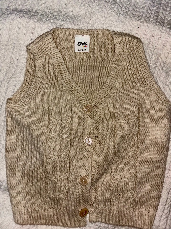 Civil ürünüdür. bej renkli, kolsuz ve fitted kesim örme süveter. Önden düğmeli, desensiz ve rahat bir streetwear tarzında. Marka etiketi 'Civil'. Hiç giyilmedi. Kalıbı bence küçük