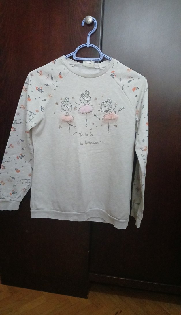 Yumuşak pamuktan üretilmiş, bol kesim bej renk kız çocuk sweatshirtü. Uzun kollu, bisiklet yaka ve pastel renkli çiçek desenli kollara sahip. Örme detaylı balerin baskısı bulunur. Alt üst takım çok iyi durumda