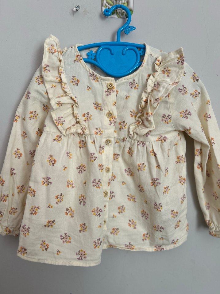 Etiketi yok kullanılmadı Bej renkli, uzun kollu, pamuklu kız çocuk bluzu. Fırfır detaylı, bol kesim ve pastel çiçek desenli, bohem tarzda bir ürün.