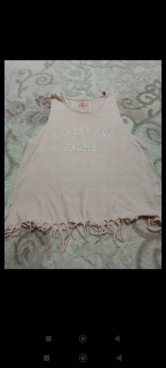 Bej renkli, pamuklu, kolsuz kız çocuk tişörtü. Salaş kesim, bisiklet yaka ve baskılı yazı detayına sahip. Alt kısmı fırfırlı püsküllü.