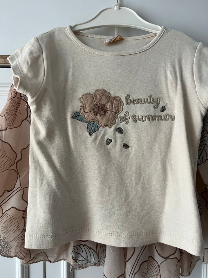 Bej pamuklu tişört, kısa kollu ve fırfırlı detaylıdır. Salaş kesim, yuvarlak yaka ve 'beauty of summer' yazılı çiçek baskısı bulunur. Eteği kabarık hanım hanımcık duran bir etek çok güzel ve temiz