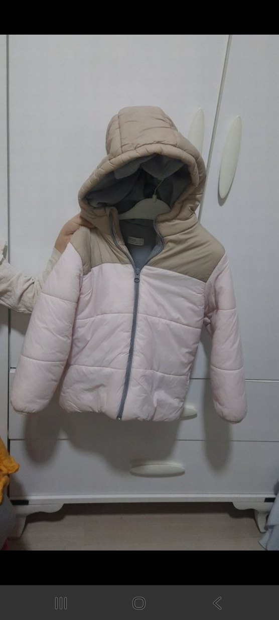 Kız çocukları için pastel bej tonlarında, kapüşonlu, fermuarlı ve kesimli yakalı, yumuşak ve sıcak kumaştan yapılmış mont.