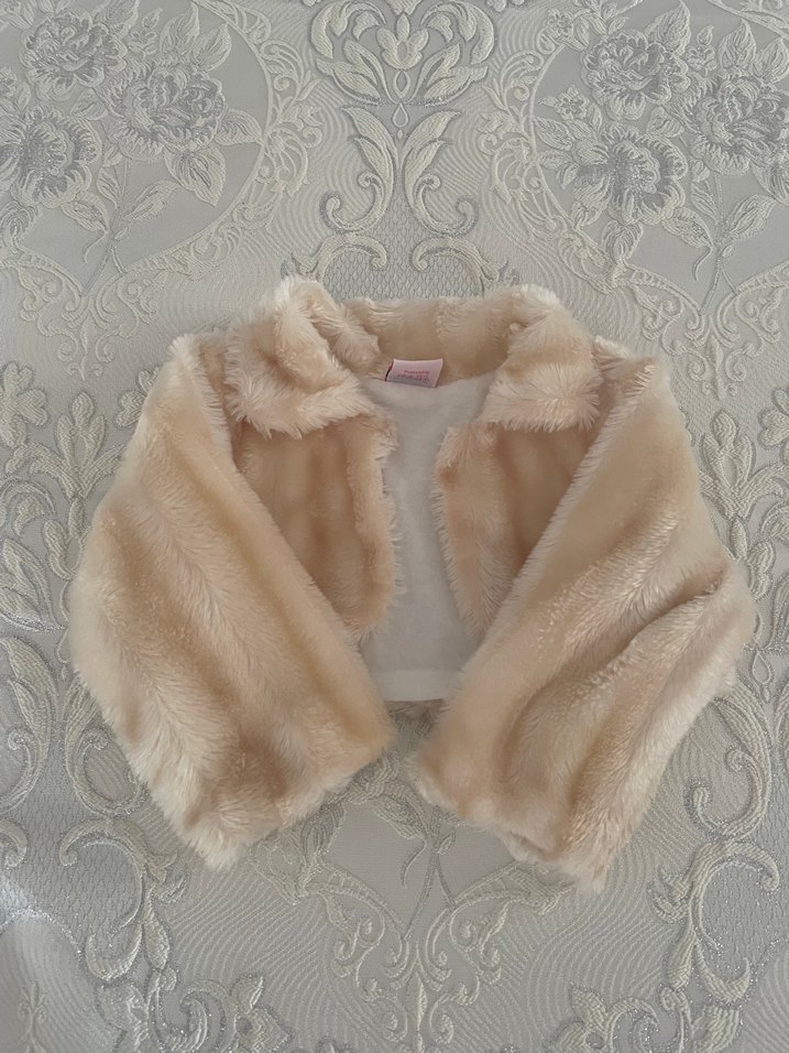 Kız çocuklar için bej renkli, uzun kollu, straplez yakalı ve kürk detaylı peluş bolero. Fitted kesim ve sade tasarımıyla klasik şıklık sunar yaka düğmesi yok