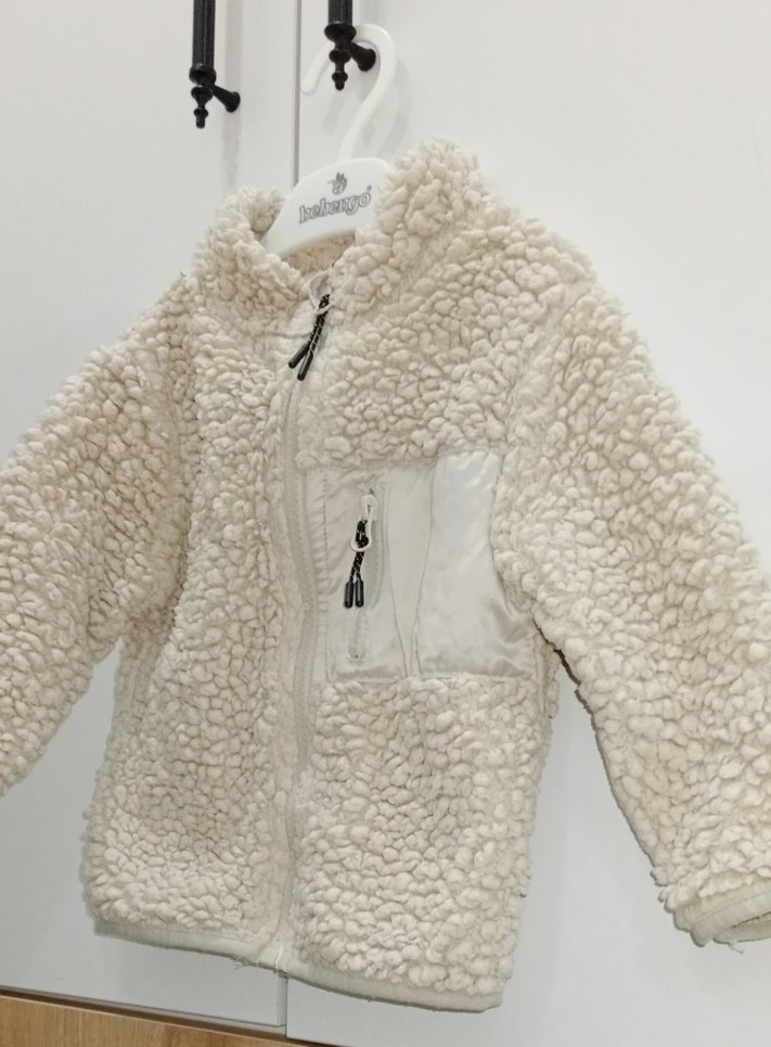 Kız çocukları için beyaz renkli, peluş detaylı, bol kesim ve bisiklet yaka ceket. Sokak stili için yumuşak ve rahat bir seçenek.