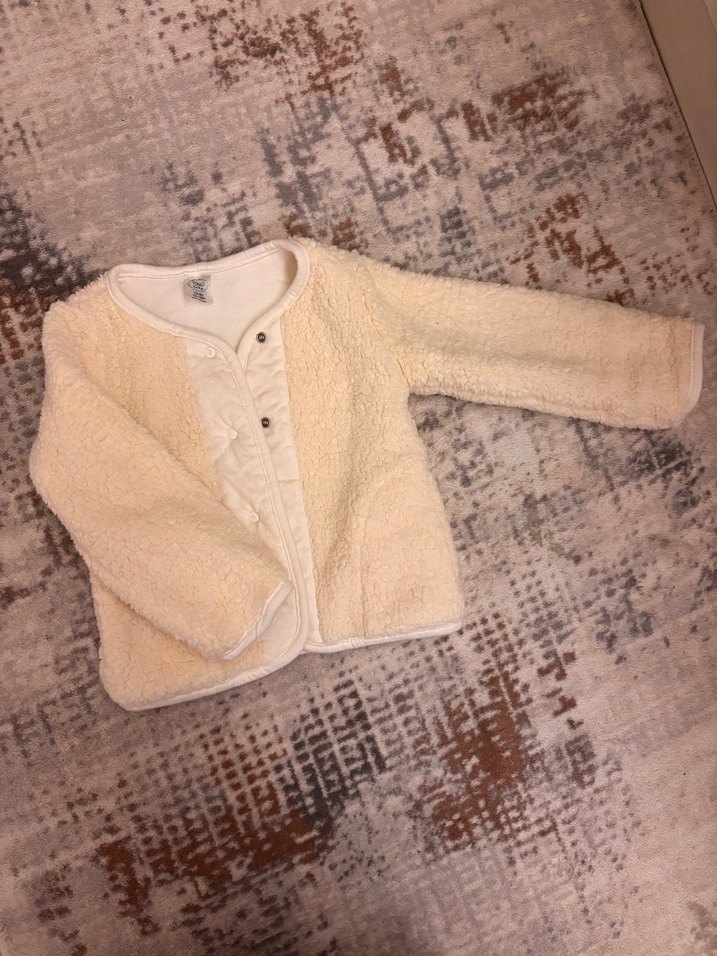 Yumuşak peluş detaylı, bol kesim kız çocuk ceketi. Bej pastel renkte, düz ve normcore tarzda, yuvarlak yakalıdır.