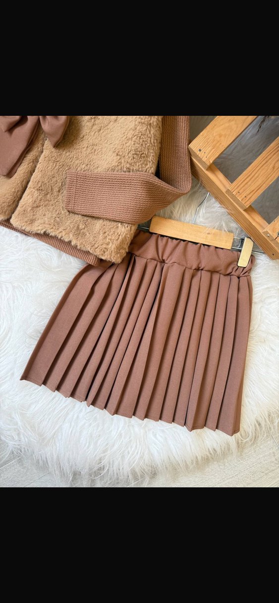 Bej renkte, pilili ve bol kesim kız çocuk eteği, yumuşak sentetik kumaştan bohem tarzında.