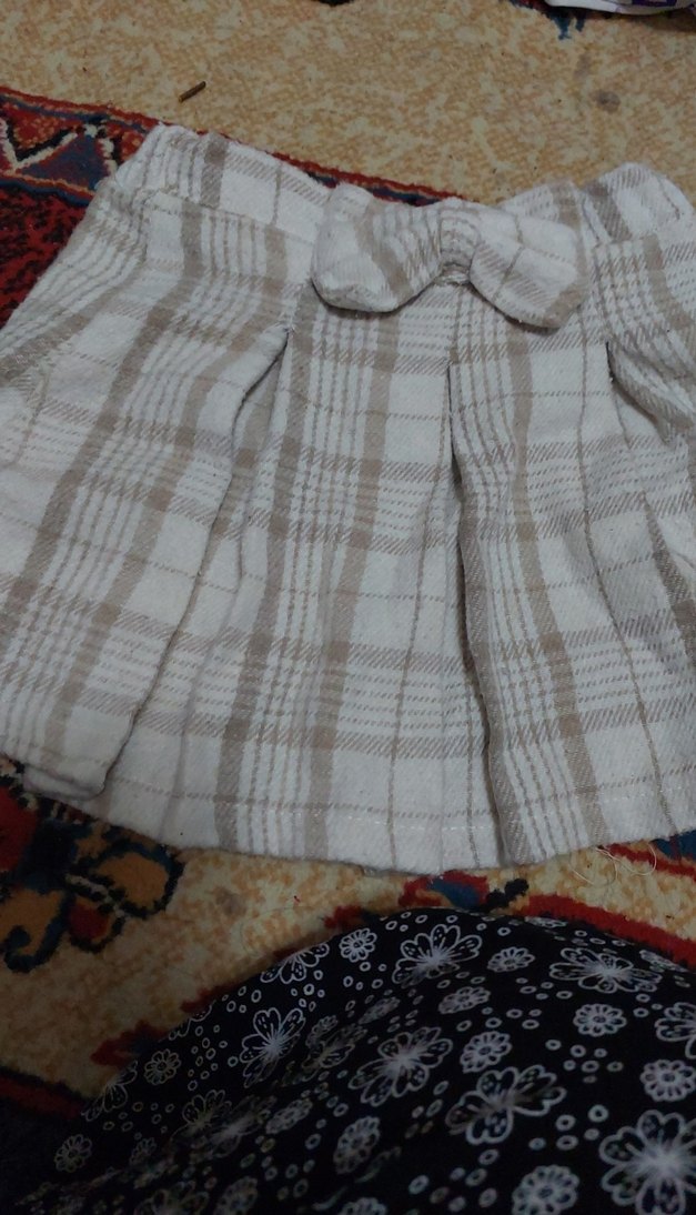 Kız çocukları için bej renkli, gri ince kare desenli, pilili ve bol kesim etek. Belinde dekoratif fiyonk bulunur.