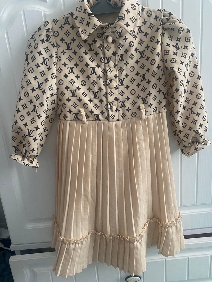 Uzun kollu, V yakalı, bol kesim kız çocuk elbisesi. Üst kısmı desenli, alt kısmı bej piliseli, yumuşak dokulu bohem tarzda.