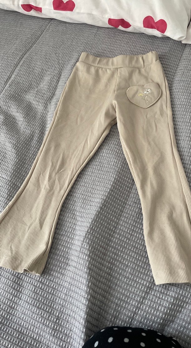 Kız çocukları için piliseli ve kalp detaylı, yumuşak sentetik kumaştan yapılmış bej dar İspanyol pantolon.