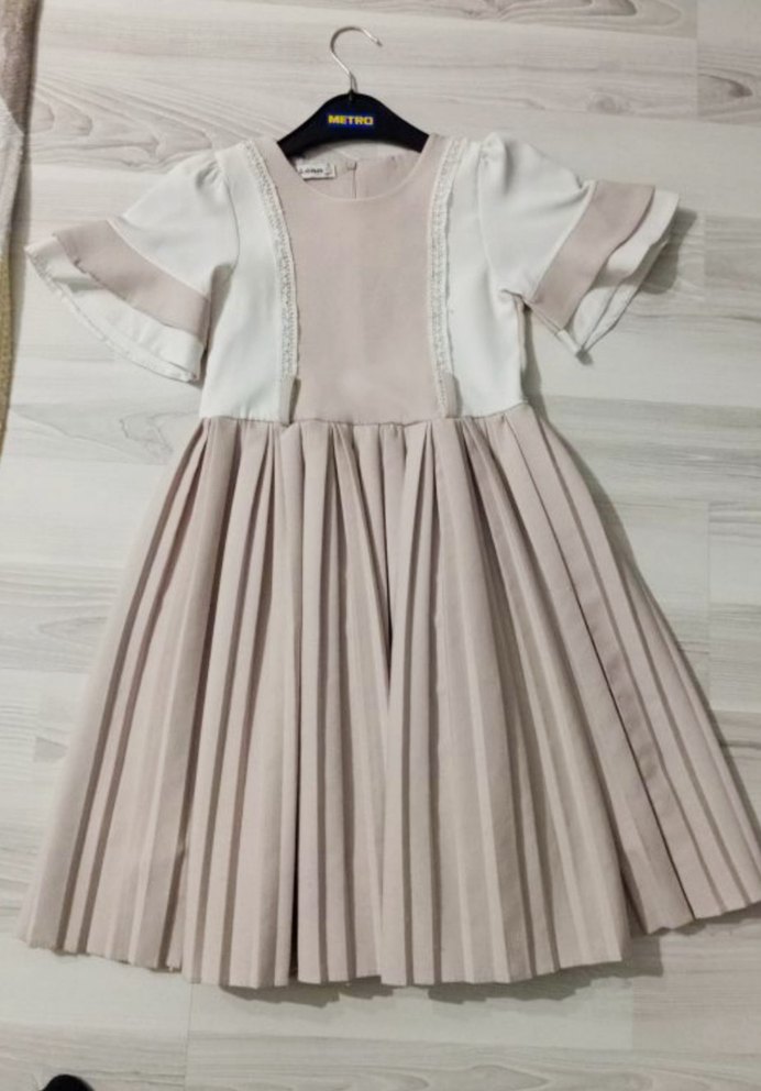 Bej renkli, piliseli etekli ve kısa kollu, yuvarlak yakalı kız çocuk elbisesi. Modern klasik tarzda, sentetik kumaştan.astar mevcut. 10 yaş kız çocuğu elbise :)
