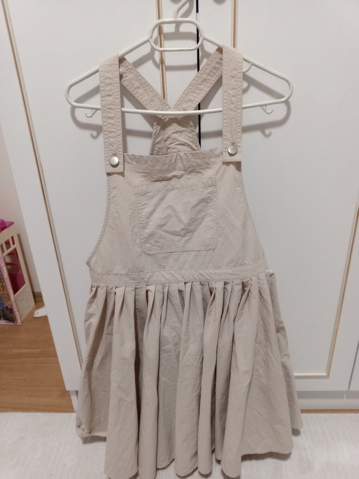 poplin kumaştan, askılı ve fırfırlı detaylı, bol kesim kız çocuk bej renkli salopet. Önden cep detayı bulunur.