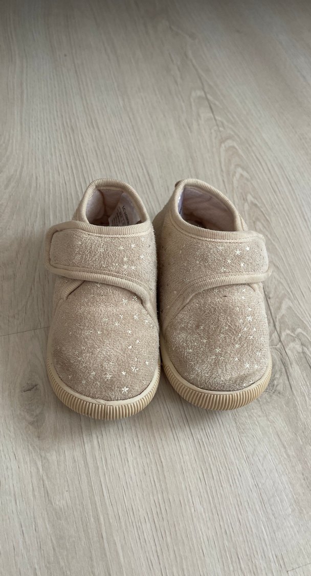 Bej renkli kız çocuk terlikleri, yumuşak kumaş ve kauçuk tabanlıdır. Cırt cırtlı kapanışı ve sade, yıldız desenli tasarımı vardır.