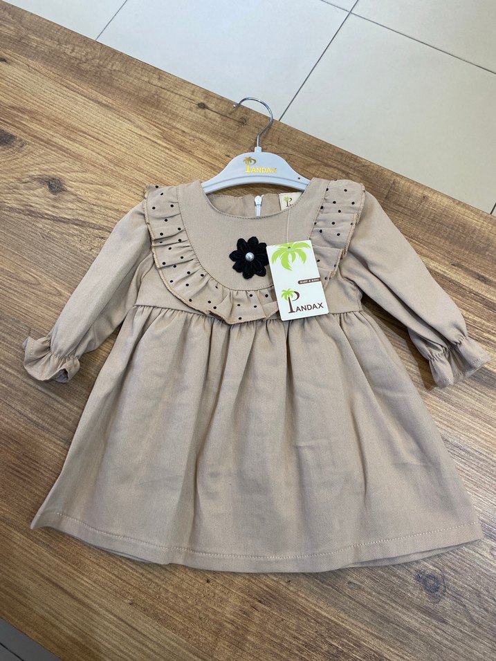 Bej süet kumaştan yapılmış, uzun kollu, bol kesim ve fırfırlı yuvarlak yakalı kız çocuk elbisesi. Trendy ve rahat bir tasarıma sahiptir.