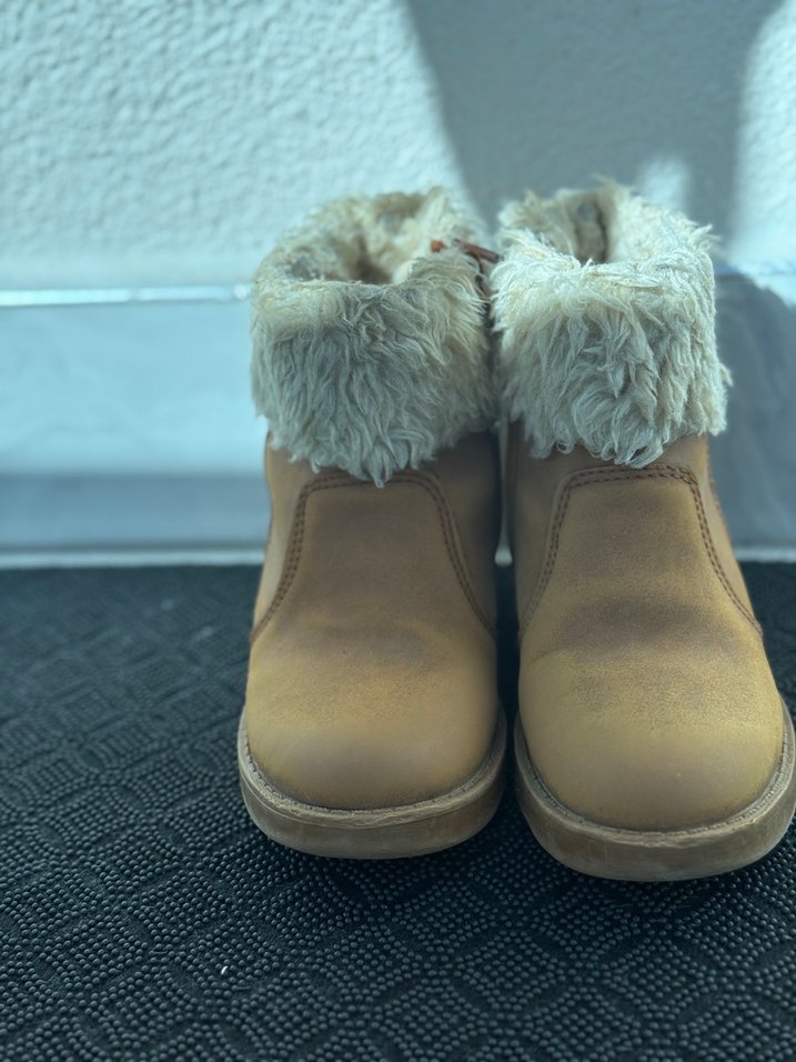 Kız çocukları için bej süet botlar, bilek kısmında yumuşak kürk detayına sahiptir. Desensiz, rahat ve trend bir görünüme sahiptir.