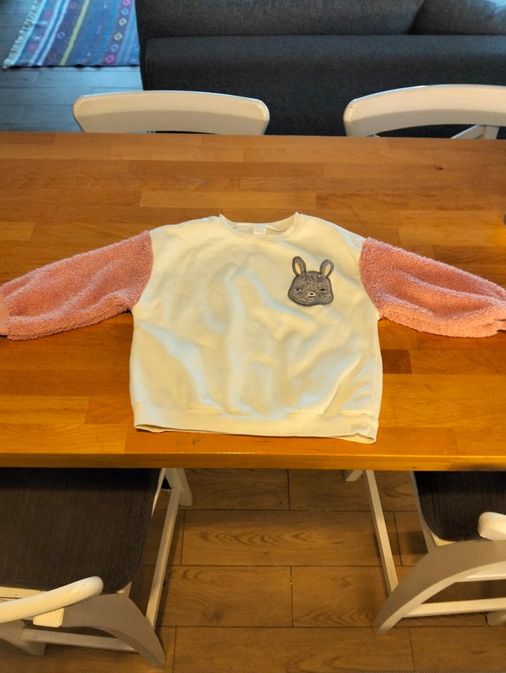 Krem rengi gövdesi ve pastel pembe peluş kolları olan, uzun kollu, bisiklet yaka, bol kesim kız çocuk sweatshirtü. Tavşan desenli baskısı ile rahat sokak tarzı için uygundur.