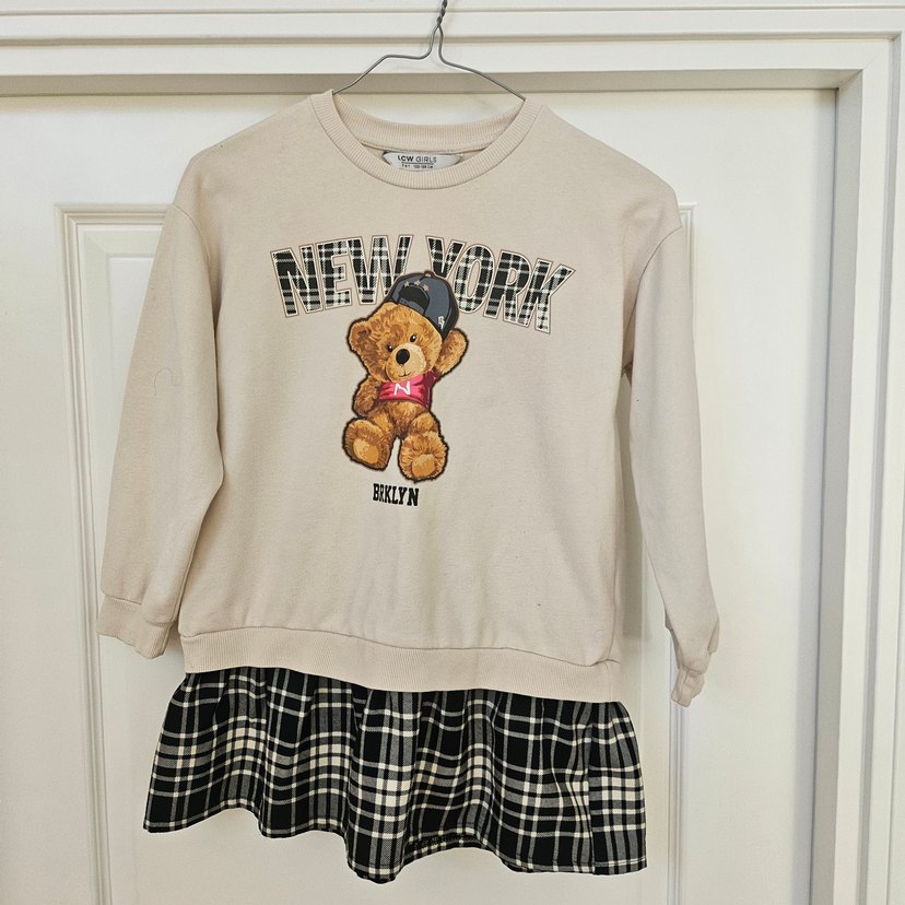 Kız çocuk için bol kesim, uzun kollu bej sweatshirt. Üzerinde "NEW YORK" baskılı ayıcık ve fırfır detayı bulunur. Yumuşak ve sıcak kumaştan üretilmiştir. EKLYN baskılıdır.