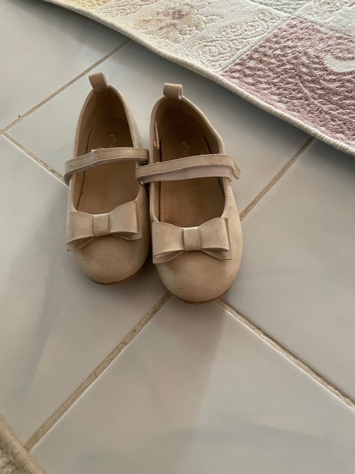 Bej renkte, tokalı kayış ve fiyonk detaylı kız çocuk babet ayakkabılar. Rahat ve dayanıklı kauçuk malzemeden üretilmiştir. Modern klasik ve desensiz tasarım.
