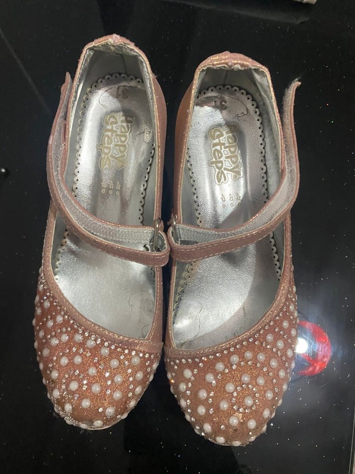 Bej renkli, parlak yüzeyli kız çocuk babeti. Tokalı kayışı ve küçük inci detayları ile konvansiyonel tarzda, kauçuk tabanlıdır.