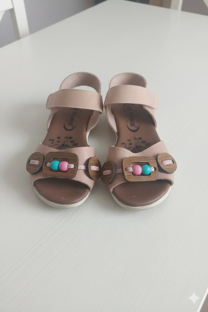 Kız çocukları için pastel bej renkte tokalı sandaletler, renkli boncuk detaylıdır. Kauçuk malzemeden üretilmiştir.