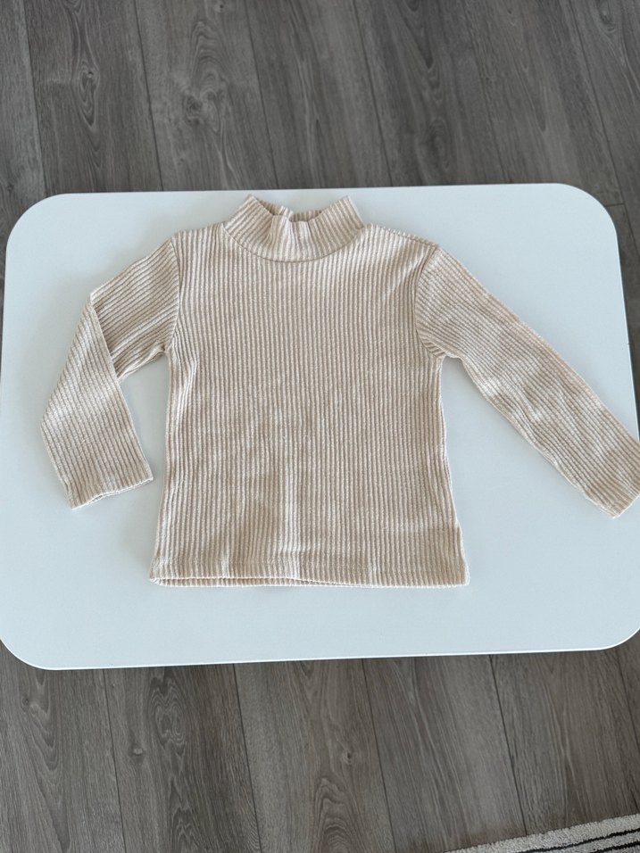 Kız çocuk için bej renkli, triko kumaştan, boğazlı ve uzun kollu, vücuda oturan yumuşak keten kazak. Desensiz, sade ve temel tarzda.
