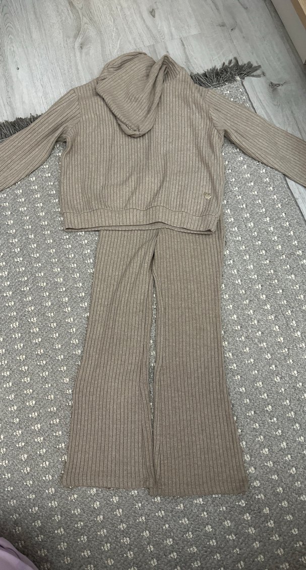 Kız çocukları için bej renkli, uzun kollu, triko kumaştan yapılmış, boğazlı ve regular fit üst ile pantolon takımı. Düz desensiz ve fitilli dokuma detaylıdır.