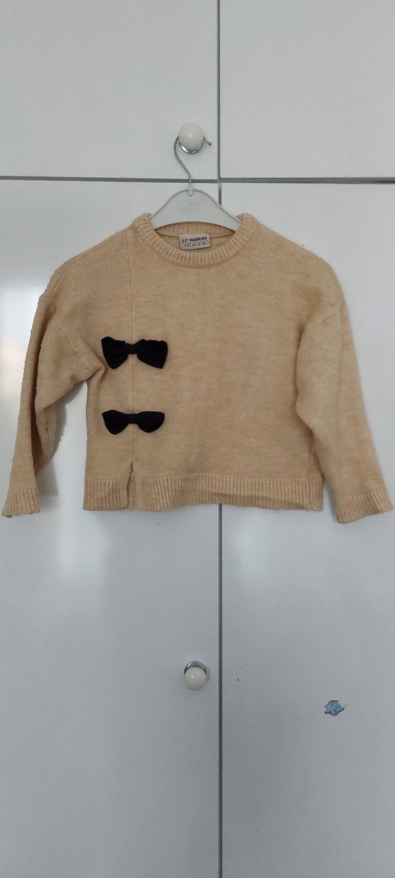 Bej renkli, uzun kollu, yuvarlak yaka kız çocuk triko kazak, ön kısmında iki siyah fiyonk ve rahat bir bol kesime sahiptir.