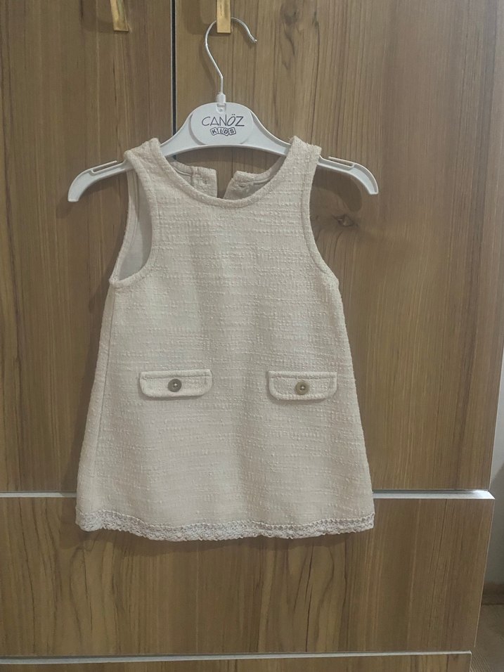 Bej renkli, kolsuz kız çocuk elbisesi, yumuşak triko kumaştan, yuvarlak yaka ve bol kesimlidir. Önünde iki küçük cep bulunur, desensiz sade tasarıma sahiptir.
