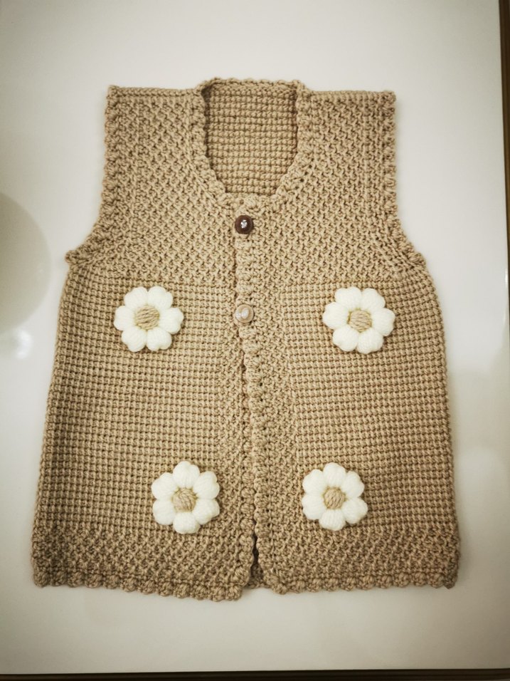 Kız çocuk bej renkli, triko dokulu, işlemeli çiçek detaylı kolsuz yelek. Bisiklet yaka ve rahat kesimlidir, bohem tarzda. El örgüsüdür.