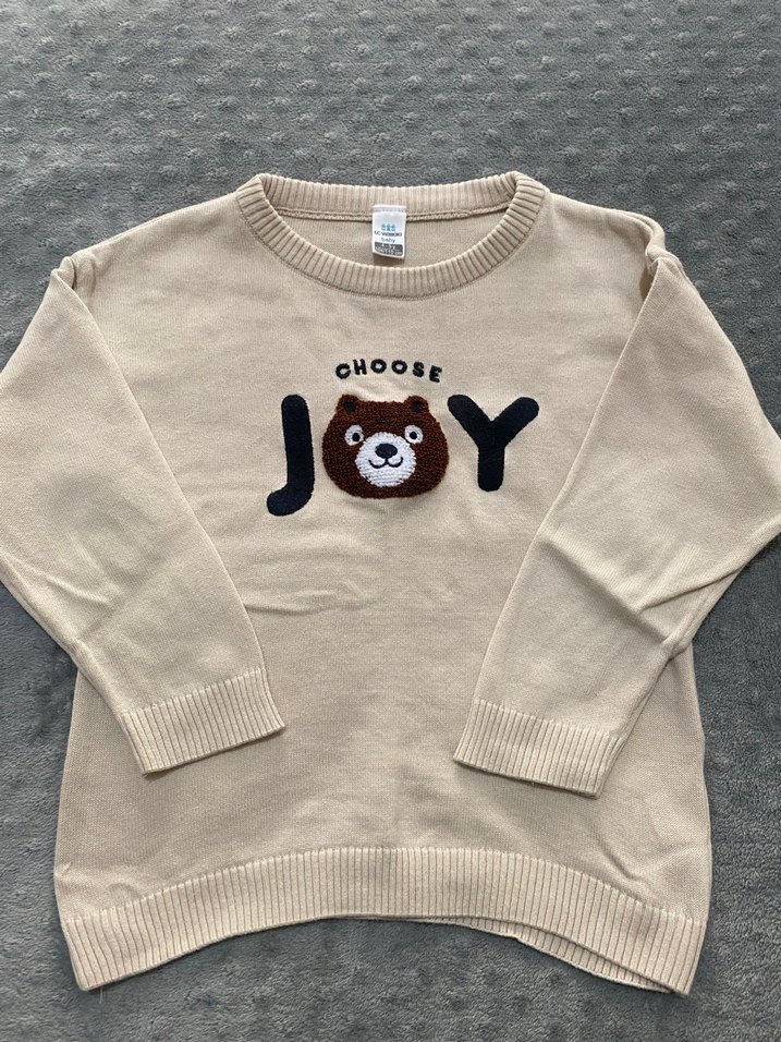 Kız çocuklar için bej renkli, uzun kollu, yuvarlak yakalı ve bol kesim triko kazak. Üzerinde 'CHOOSE JOY' yazısı ve ayı figürü baskılıdır. Rahat sokak stili için uygundur.