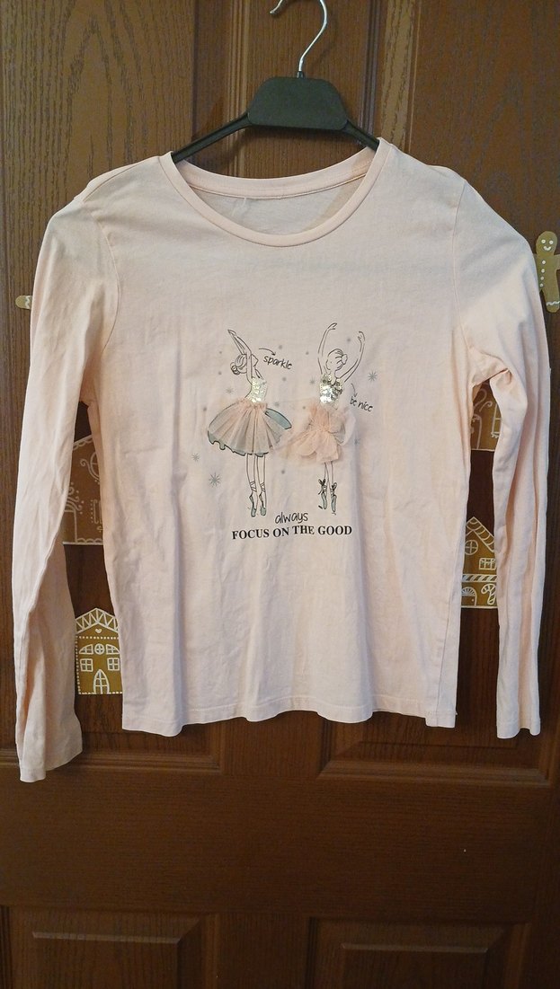 Pamuklu, bej renkli, uzun kollu ve salaş kesim kız çocuk tişörtü. Balerin baskısı ve 'FOCUS ON THE GOOD' yazısı bulunur .