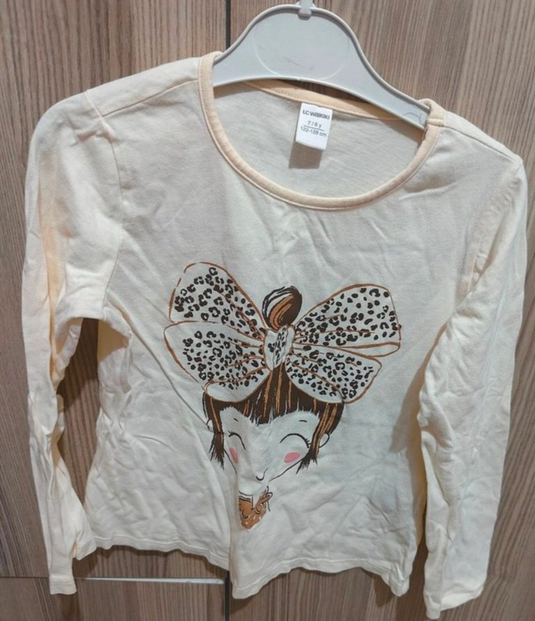 Kız çocukları için bej renkli, uzun kollu, yuvarlak yakalı, baskılı ve fiyonk detaylı bol kesim tişört. Yumuşak sentetik kumaştan üretilmiştir.