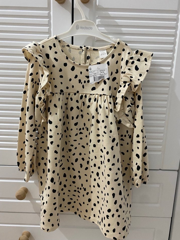 Bej renkli, uzun kollu kız çocuk elbisesi. Fırfırlı detayları ve bol kesimi vardır. Suni kumaştan, baskılı deseniyle günlük sokak tarzına uygundur.