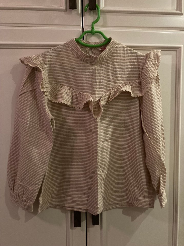 Bej renkli kız çocuk bluz, uzun kollu ve yakalıdır. Göğüste fırfır detayları bulunur ve keten kumaştan üretilmiştir. Bol kesimiyle bohem tarzını yansıtır.