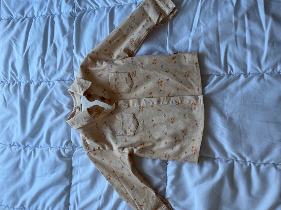 Bej pastel tonlarda, uzun kollu, düğmeli ve yakalı, bol kesim kız çocuk gömleği, hafif çiçek desenli.